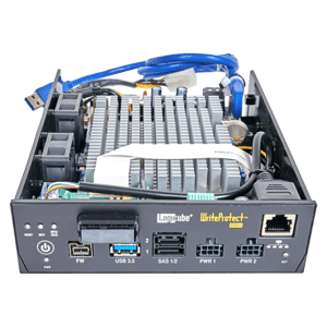 The WriteProtect-BAY supports 6 hard drive interfaces in one device. Supports SAS,SATA, FireWire, USB3.0, PCIe and IDE source drives, and utilizes an ultra-fast Superspeed USB3.0 host connection.